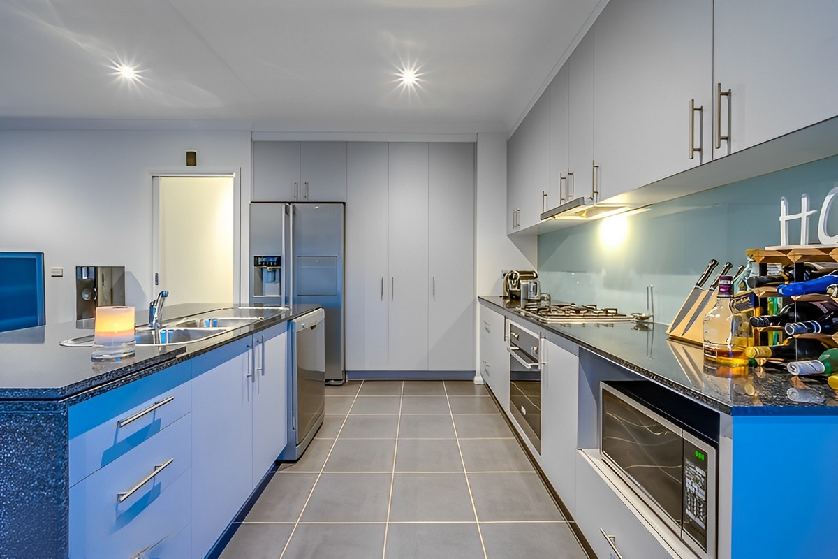 * Tiled Splashback in the Kitchen with Stone Bench tops with waterfall on both endsof Island Bench